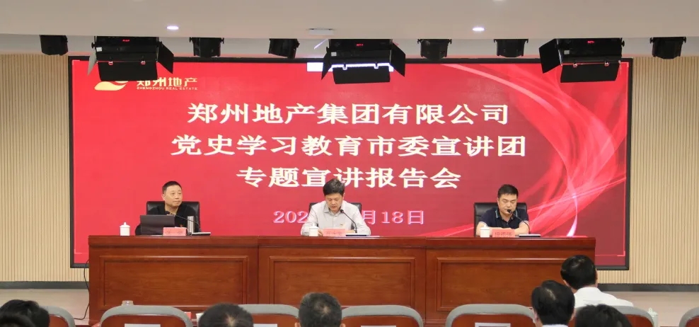 為持續(xù)推進(jìn)黨史學(xué)習(xí)教育走深走實(shí),5月18日上午,鄭州市委宣講團(tuán)走進(jìn)鄭州地產(chǎn)集團(tuán),在集團(tuán)301多功能廳開展黨史學(xué)習(xí)教育專題宣講報告會。報告會由鄭州市委宣講團(tuán)成員、鄭州工程技術(shù)學(xué)院馬克思主義學(xué)院副教授張豪主講,市國資黨史學(xué)習(xí)教育第二巡回指導(dǎo)組組長、四級調(diào)研員段德強(qiáng),指導(dǎo)組成員張?jiān)娪?、陳祥斐到會巡聽旁聽,地產(chǎn)集團(tuán)領(lǐng)導(dǎo)班子、總部全體員工,各子公司支部書記、黨建部門負(fù)責(zé)人等共計(jì)150余人參加現(xiàn)場報告會,各子公司員工共計(jì)170余人通過線上直播進(jìn)行觀看,會議由地產(chǎn)集團(tuán)黨委書記、董事長萬永生主持。